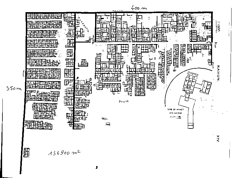 In the West district (left of the map) of this huge funeral city which covered 14.7 hectares, a quantity of non-Egyptian objects coming from Syria and Cyprus was recovered, testifying of a significant presence of Amorite people in Egypt on the beginning of 19th century B.C. (Twelfth Dynasty), Middle Kingdom in Egypt). This first phase of installation of a group of emigrating "Asiatics" (Amorites) could correspond to the arrival of the tribe of Jacob welcomed by Joseph minister of Pharaoh as mentioned in the Bible (Genesis 45: 14, 46, 47-11).