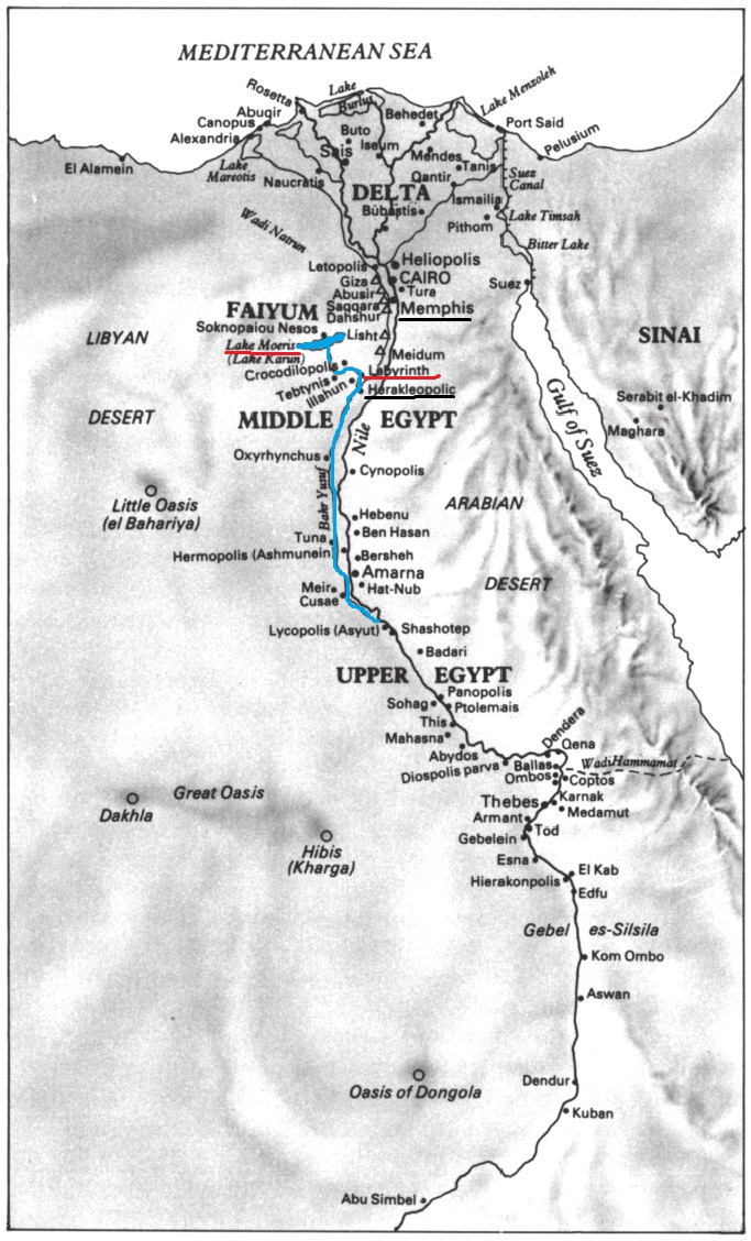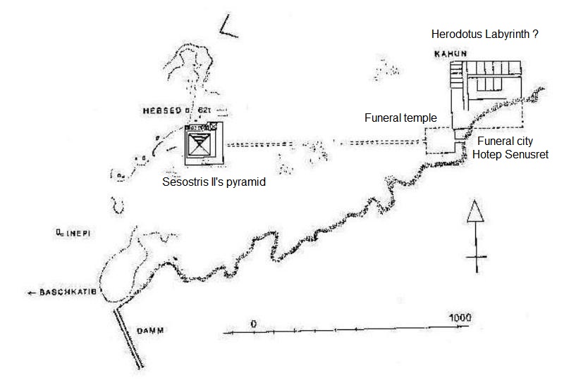 These high personalities were some princes close parents of the defunct pharaoh, in charge of maintaining his cult in the temple of the pyramid. His successor Pharaoh Sesostris III had made of it a royal fortress and administrative capital of his kingdom. Its location at the entrance of the Fayum oasis near the big lake of Moeris and at midway between the delta and the rest of Egypt allowed the city to be easily supplied by the channel of the Bahr Youssef (Channel of Joseph) which joined it to the Nile. It allowed also to control the productions of this particularly fertile region, a real reserve of grains and pastures for livestock. The very particular structure of the interior of the twelve big palaces of the East district led ancient authors to designate this giant architectural complex as "the Labyrinth of Egypt."